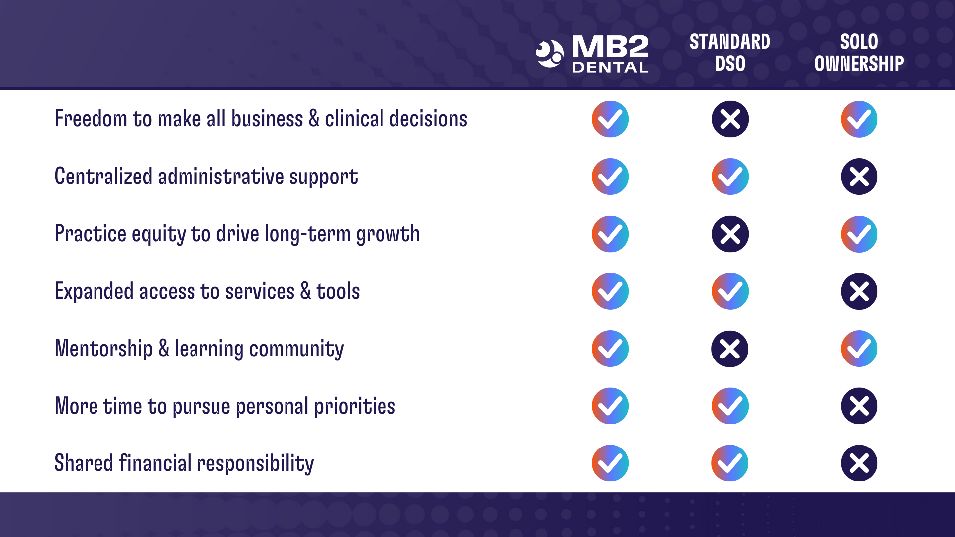 The ideal practice model depends on your priorities. A DSO might be a good fit if you are a dentist seeking a hands-off approach and are comfortable relinquishing control. However, if you value your autonomy and want to retain control over your practice’s identity and direction, MB2 Dental’s DPO offers a compelling alternative.